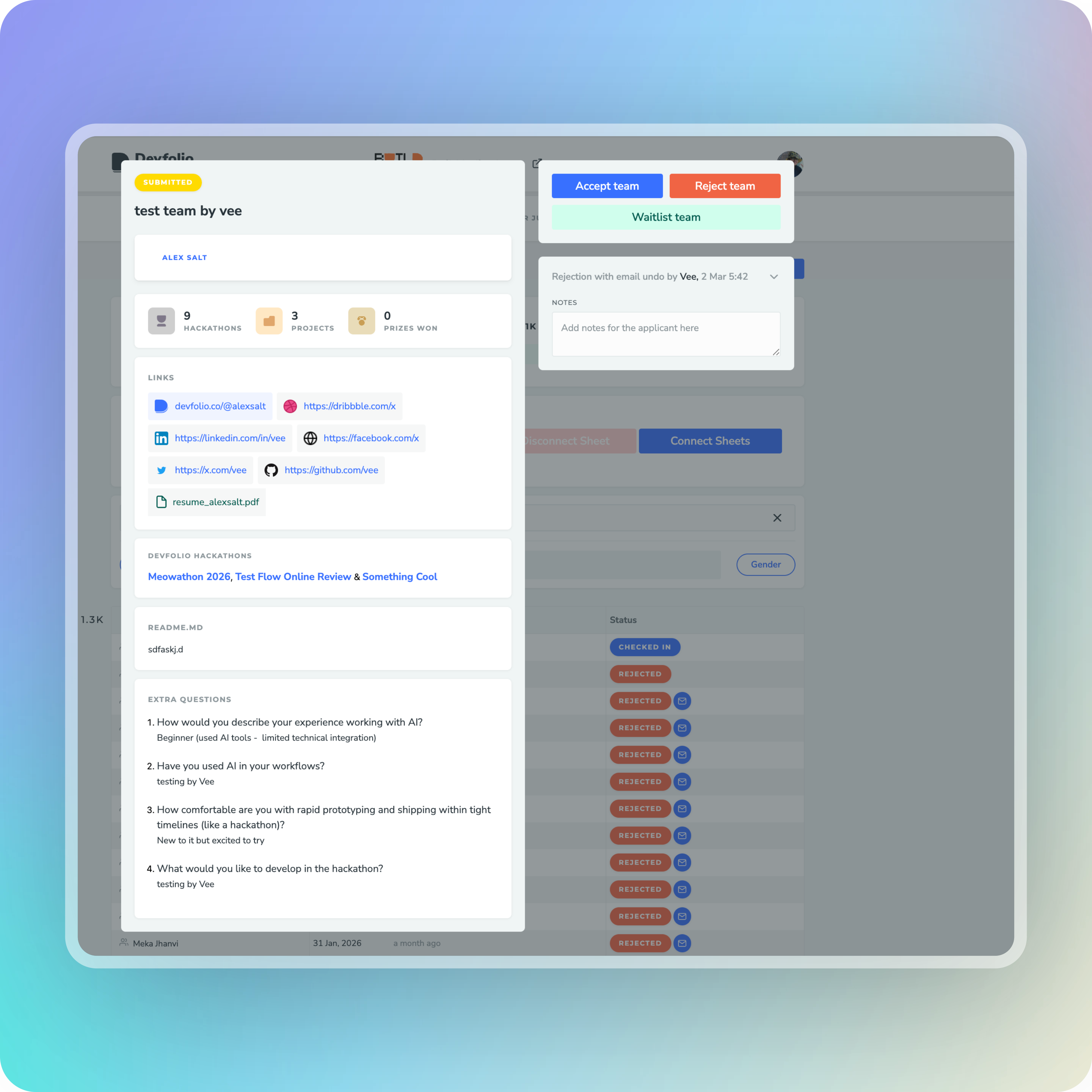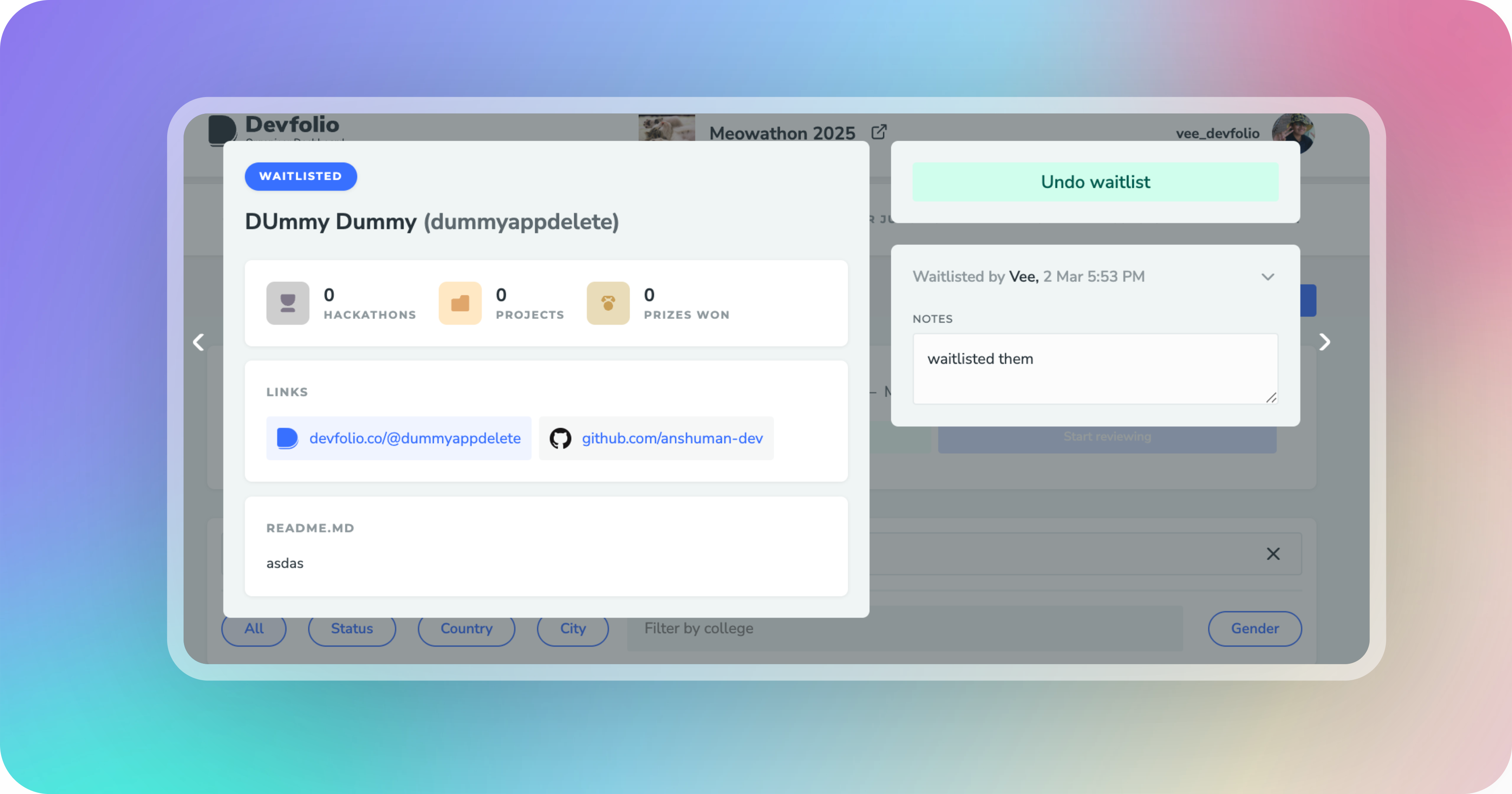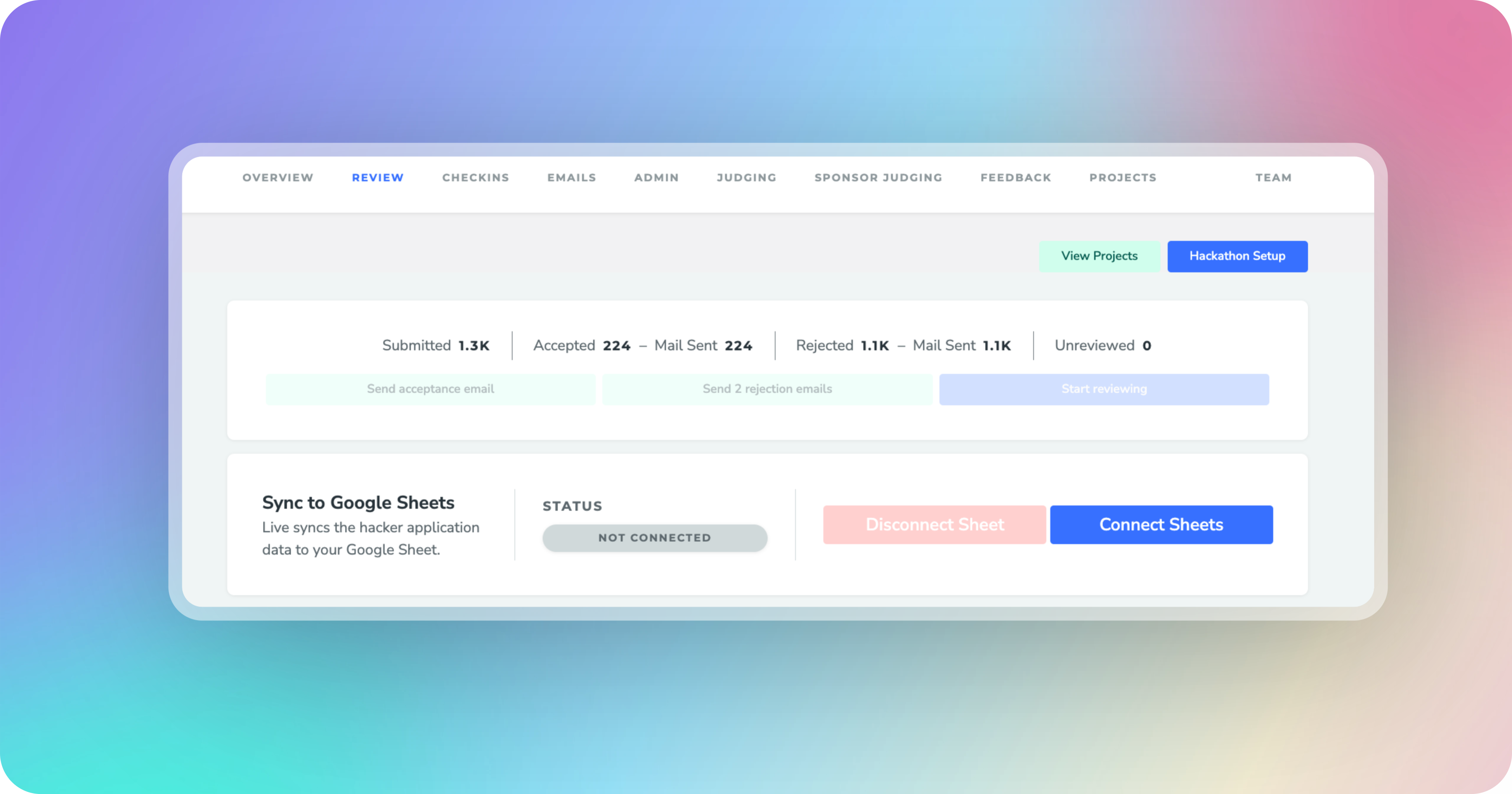 The Review Tab helps you accept, reject, or waitlist applications as per your hackathon guideline.